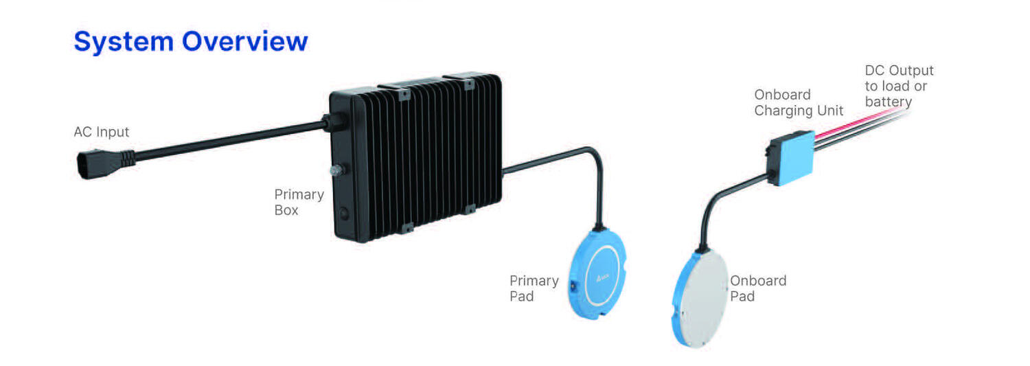 Systemet är ubyggt av 2 delar, primär del med AC box samt sändar PAD samt sekundär del med laddare och mottagar PAD.